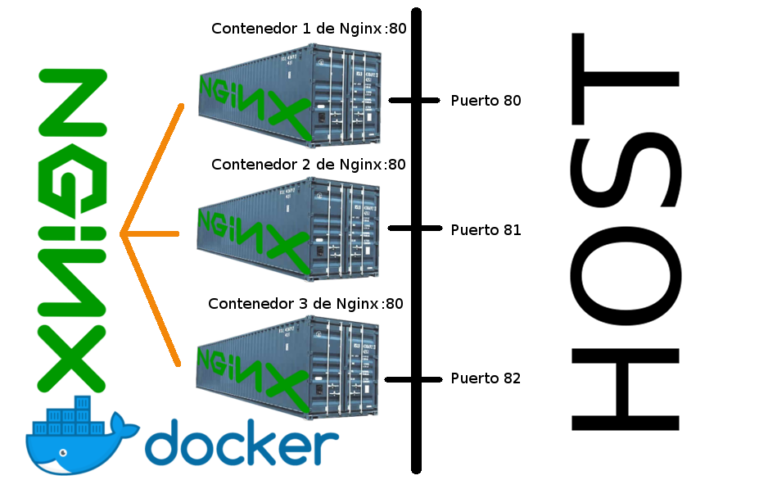 El primer contenedor tiene mapeado su puerto local 80 al puerto 80 del host (servidor o maquina), de tal manera, que si el usuario accede a la web al sitio en el puerto 80, visualizará la web de este contenedor.